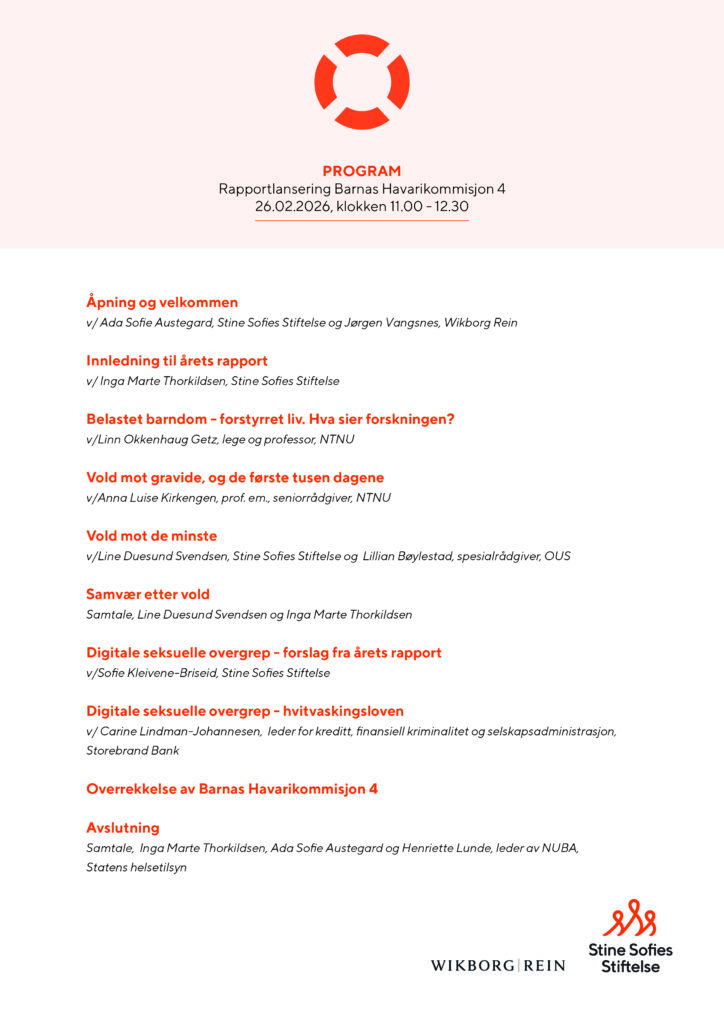 Sammen med advokatfirmaet Wikborg Rein, har vi i Stine Sofies Stiftelse gitt ut rapporten Barnas Havarikommisjon siden 2023. Dette er en årlig rapport som retter søkelyset på rettssikkerheten til barn og unge utsatt for vold og overgrep. Rapporten presenterer konkrete løsningsforslag til politikerne og embetsverket, og vil være barnas juridiske stemme inn til politikerne.